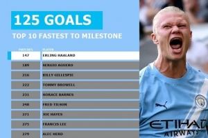 据媒体统计,哈兰德加盟曼城以来出战147场比赛,打进125球,成为曼城历史上最快达成125球的球员,比第二快的阿圭罗少用42场比赛。
