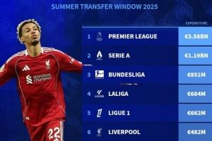 2025夏季转会窗各联赛支出支出榜: