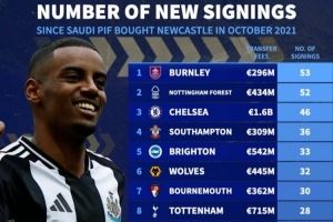 沙特入主纽卡后英超引援人数榜:切尔西46人第3 纽卡21人仅第13